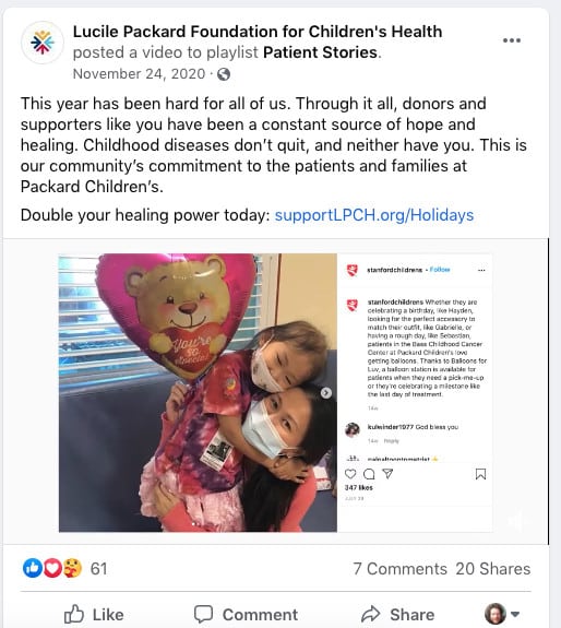 To create variety we sent emails under several different email signers including: institutional signers (Support Packard Children’s (MATCH); Lucile Packard Team, etc.), doctors, fundraising and financial personnel, and parents of patients.